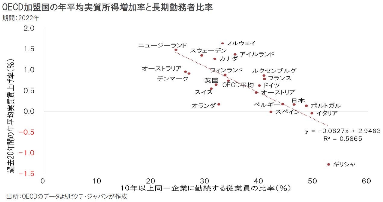 OECD加盟国では、10年以上同一企業に勤続する従業員の比率が小さいほど、過去20年間における平均賃上げ率が高い。成熟産業から成長産業、儲からない企業から儲かる企業へ人の移動が進むことで、生産性の押し上げが図られている可能性を示唆する結果だ。一般論から言えば、終身雇用制は社会を安定させる反面、労働生産性の伸びを抑制し、賃上げを難しくする要因なのではないか。