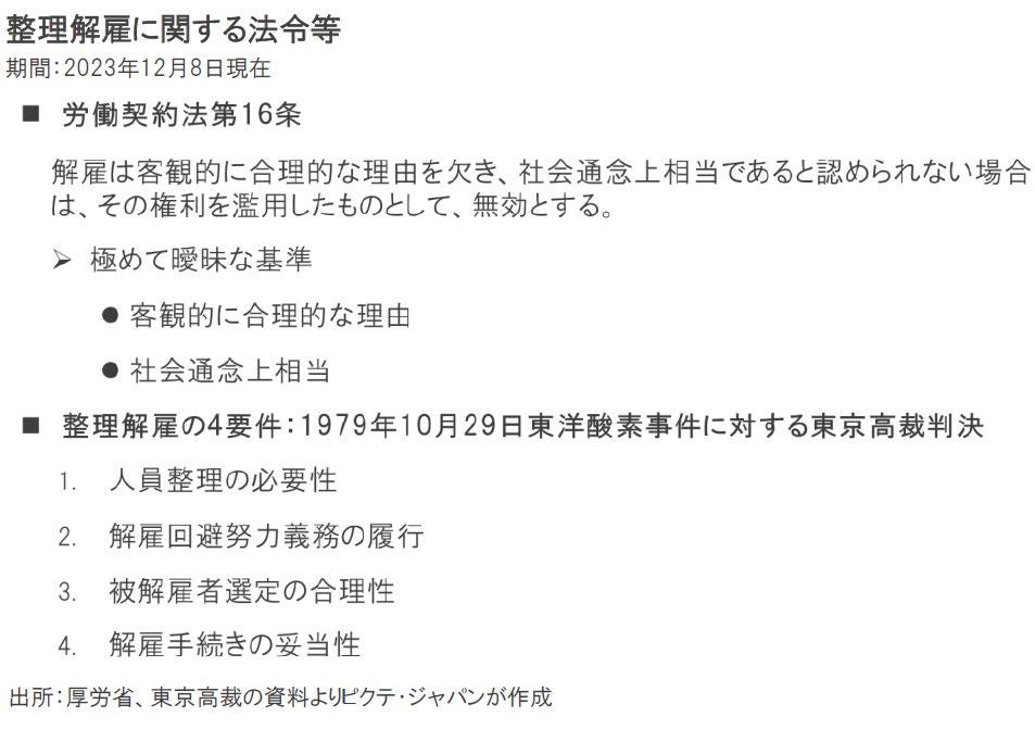 日本の整理解雇に関する法令は極めて曖昧だ。実務的には『整理解雇の4要件』が基準とされるものの、これは1979年の東京高裁による判決に過ぎない。法令ではないため、企業はこの基準に照らした判断に関し、整理解雇前に監督官庁からノーアクションレターを得るのは難しいだろう。結果として、企業は不採算部門の閉鎖などに踏み切ることが難しく、生産性の向上が阻害されているのではないか。