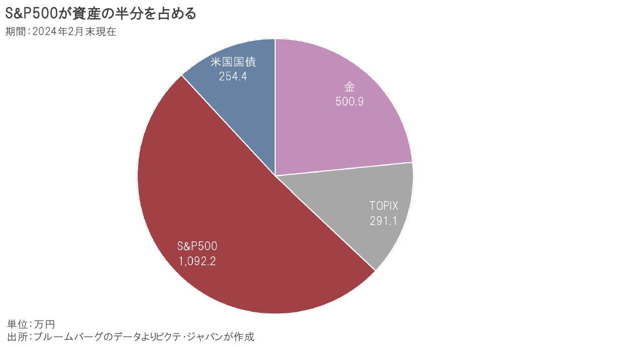 当該シミュレーションにおいて、2月末時点での各資産の構成は、金が501万円、TOPIXは291万円、S&P500は1,092万円、米国国債は254万円だ。2月はポートフォリオ全体で1月末の時価総額に比べ104万円増加しましたが、資産規模の大きなS&P500の寄与度は74万円に達した。米国国債はドル建てインデックスが1.3%下落したものの、2月は円が対ドルで2.1%の円安となり、円換算ではプラスを維持した。