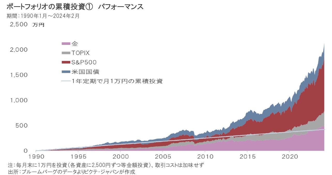 バブル崩壊期の起点である1990年1月より、金、日本株(TOPIX)、米国株(S&P500)、米国国債の4資産に2,500円ずつ等金額累積分散投資を行ったと仮定したシミュレーションでは、409ヶ月目に当たる今年2月末、ポートフォリオの時価総額は2,139万円になった。同じ期間、1年物定期預金への累積投資した場合、現在の時価は423万円だ。あくまで過去のシミュレーションだが、リスクを負った成果は十分と言えるのではないか。