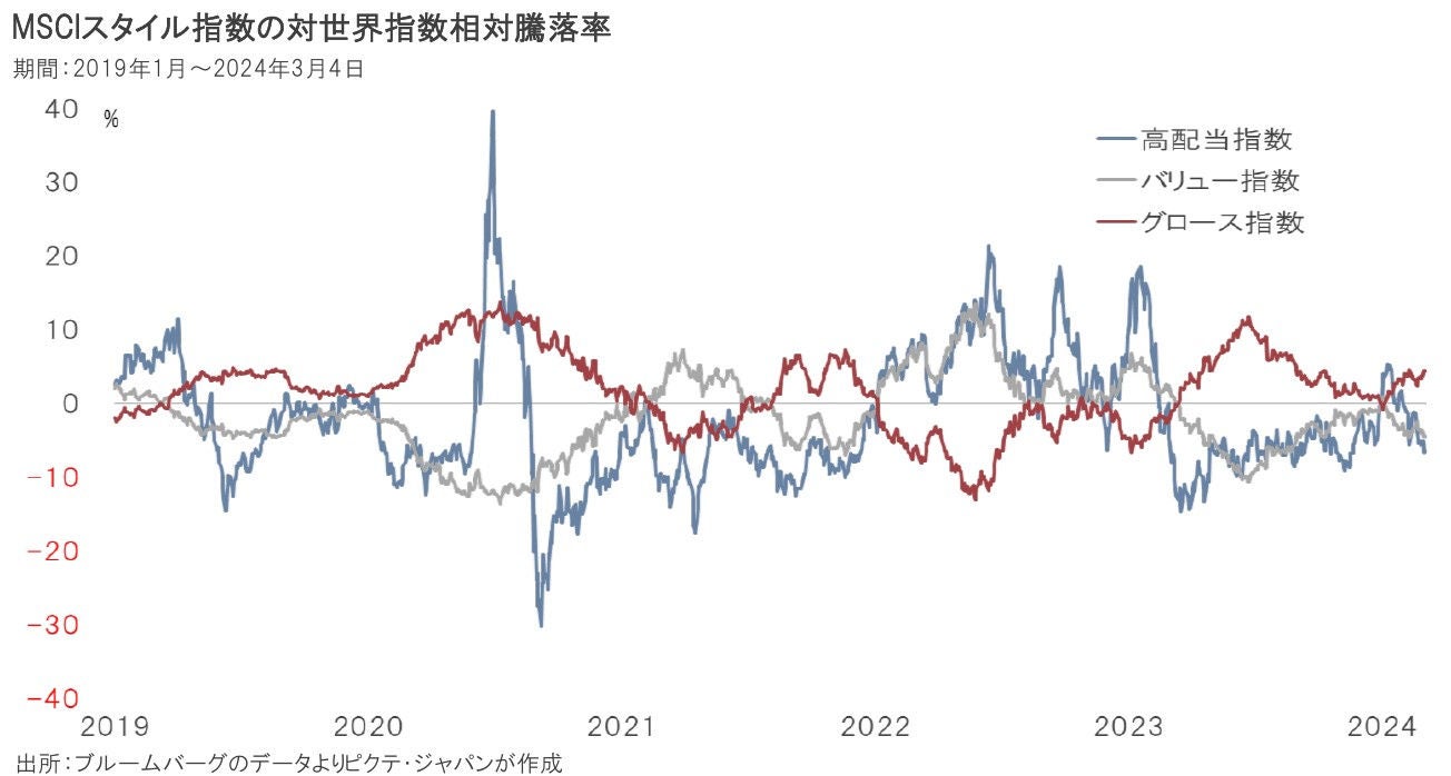 日米両市場において半導体関連主導の相場展開が続くなか、一極集中型のマーケットでは高所恐怖症を感じる投資家が増えていても不思議ではないだろう。MSCIのスタイルインデックスでは、足下、グロース株指数が世界指数をアウトパフォームしている。NVIDIAの決算は半導体の将来を楽観視させるものではあったが、長期投資の原点に立ち返れば、こうした時こそ分散を心がけるべきではないか。