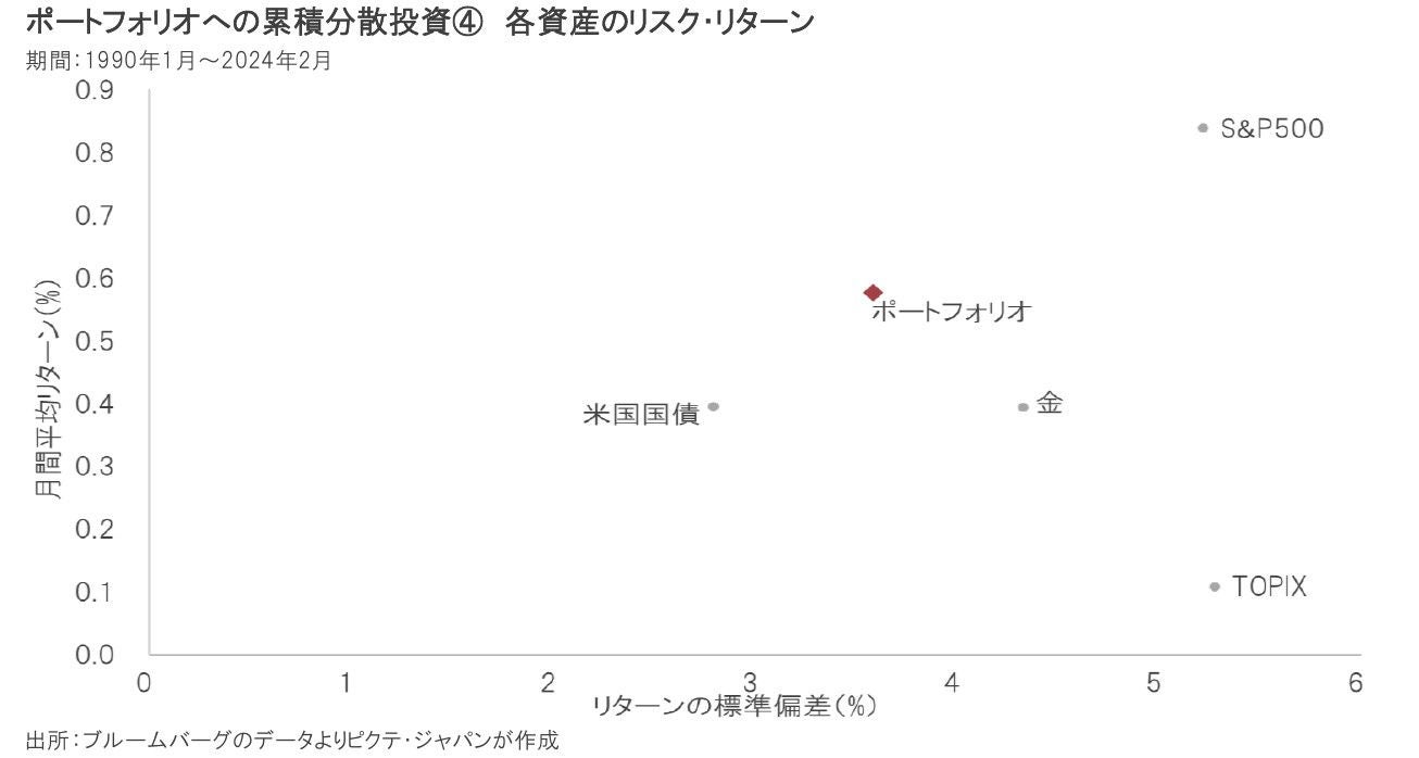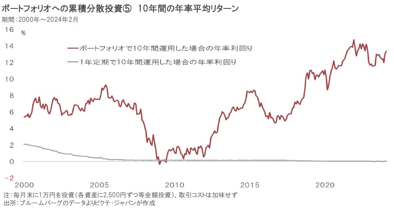 運用開始から10年後の2000年1月以降、月毎に直近120ヶ月のパフォーマンスを追うと、リターンがマイナスになったのはリーマンショック期のみだった。分散化された適切なポートフォリオを長期間保有することで、パフォーマンスの安定を図ることができたのだろう。これはあくまで過去のシミュレーションであり、将来を約束したものではないが、分散の効果を理解する上で十分な証拠と言えるのではないか。