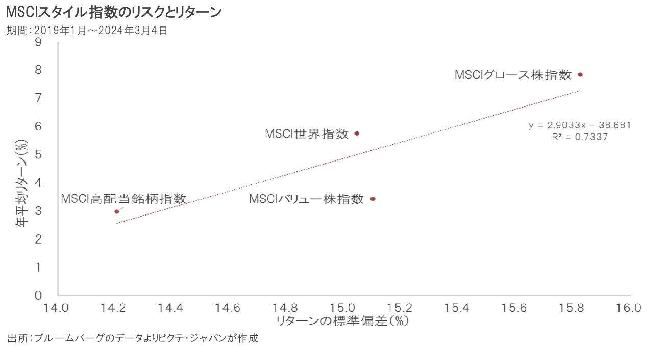 MSCIの世界指数、高配当株指数、バリュー株指数、グロース株指数に関し、リターンの標準偏差、即ちリスクと年平均リターンの関係を統計的に見ると、少ない標本数ながら、概ね正の相関関係が指摘できる。家計による長期的な資産形成の観点から、短期的なハイリターンを狙わずに、金融資産のポートフォリオのリスクを相対的に低くコントロールするには、教科書通りに分散投資を行うことが重要だ。