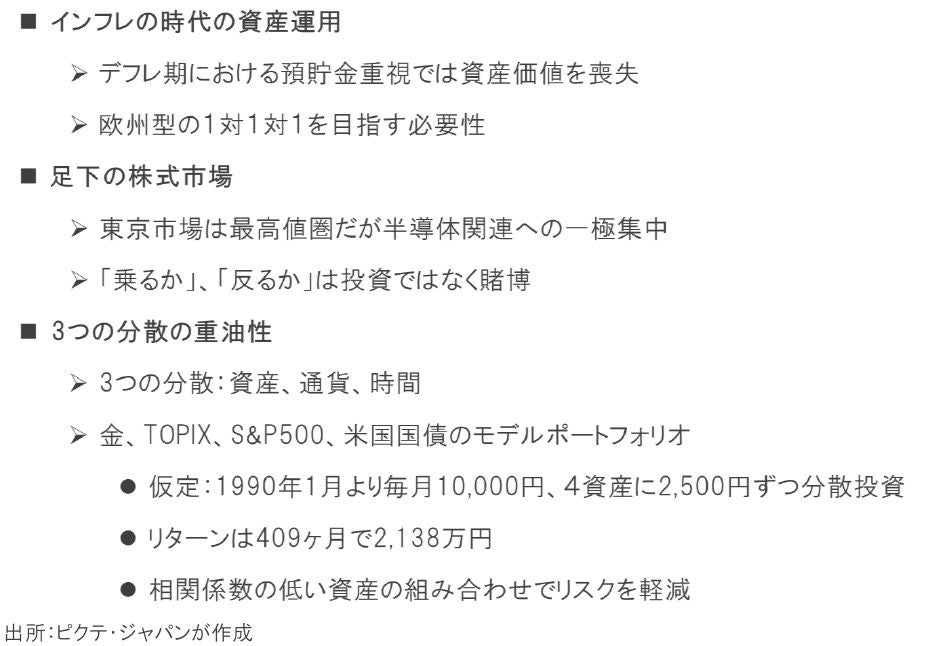 資産運用における「分散」の概念は、資産、通貨、時間の3つから構成される。今年は11月に米国大統領選挙が行われ、結果によっては世界経済が影響を受ける可能性は否定できない。そうした不確実性を強く意識した局面こそ、分散投資がより重要になるだろう。4資産ではなく広範なユニバースから投資対象を選別し、単純な等金額投資よりも、金利の動きに沿ってタクティカルなアロケーションの変更が検討されるべきだ。ただし、根本的な原則は、「資産」、「通貨」、「時間」の3つの分散と言えるのではないか。