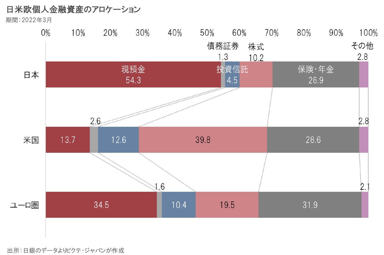 米国における家計の金融資産は、現預金比率が13.7%に止まる一方、株式・投資信託が52.4%に達している。日本、ユーロ圏に比べ高いリスクを選好する傾向が強い理由は、社会保障制度が脆弱で、自助の意識が高いことではないか。社会保障制度の充実した日本の場合、ユーロ圏の家計による現預金、株式・投信、年金・保険へ3分の1ずつ金融資産を分割する考え方が参考になるだろう。