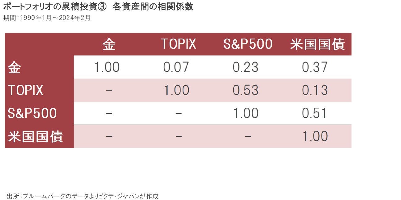 各資産間の値動きの関係を見ると、他の3資産に対する金の相関係数が極めて低い。金は利息・配当がないためバリュエーションが不透明で、金融資産としては扱い難い。ただし、希少性、応用性、美しさ、そしてポータビリティから、ニクソン・ショックによりドルと兌換が停止されたのちも、金融資産としての役割を果たしてきた。通貨価値下落(=インフレ)のヘッジ手段としては、有力な資産と言えるだろう。