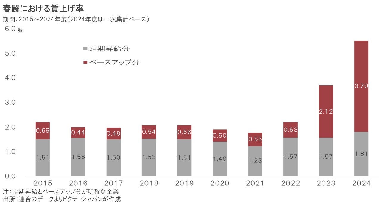 3月13日の2024年度春闘集中回答を連合が集計したところ、正味の賃上げであるベースアップは3.70%の高水準だった。連合の組織率は16.3%に過ぎず、実際の賃上げ率は2%台になる可能性はあるが、年央以降に実質賃金の伸びがプラスとなることも考えられる。それが、日銀の判断に大きく影響したことは間違いない。ただし、持続的な賃上げには生産性の向上が必須の要件となろう。