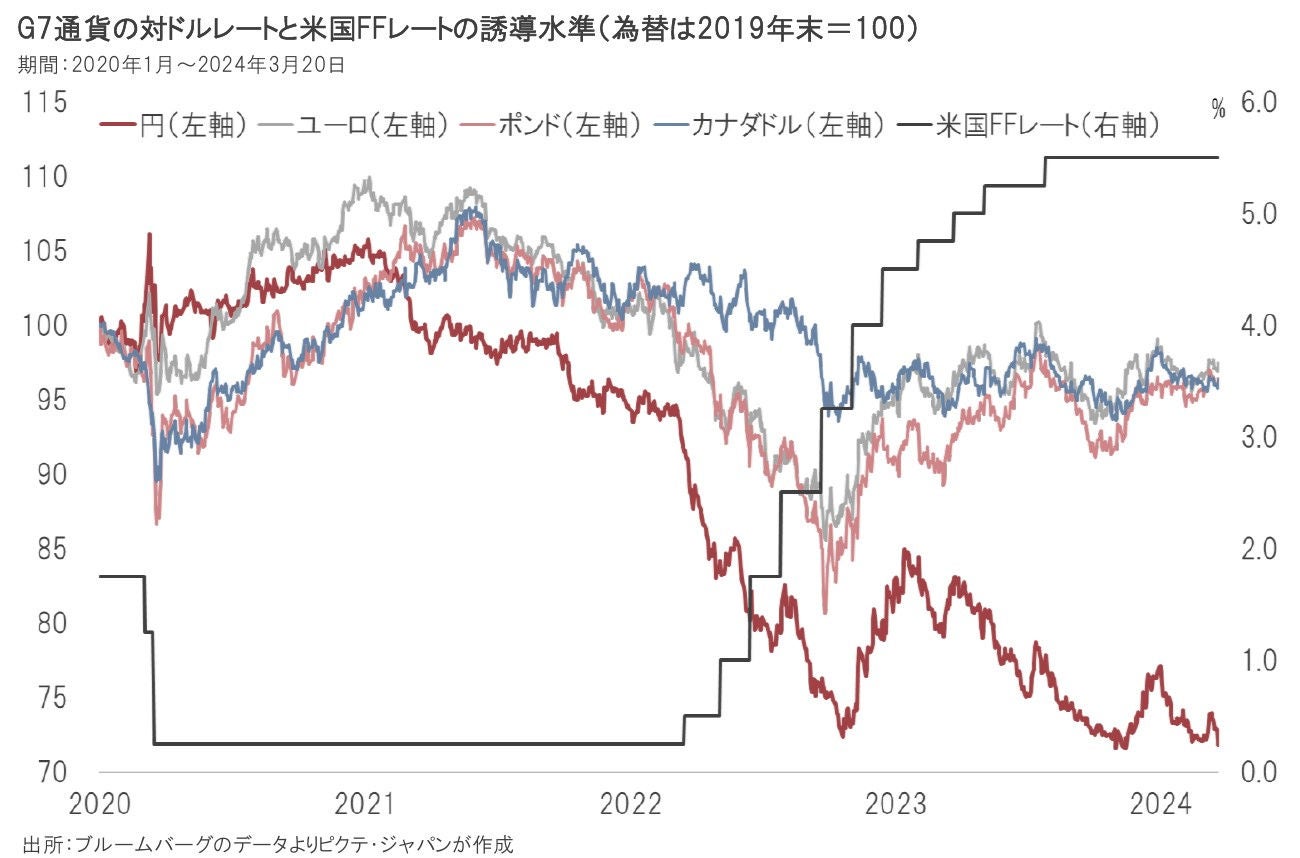 円など主要通貨が対ドルで大きく下落したのは、2022年3月にFRBが利上げしたことが背景だった。ユーロ、英ポンドなど他の通貨がリバウンドしたのは、通貨安によるインフレの加速を恐れ、ECB、BOEなどがFRBに追随する形で利上げを行ったからだろう。一方、日銀はイールドカーブ・コントロール付き量的・質的緩和を維持、日米短期金利差に着目した円キャリートレードが円安を後押ししてきた。