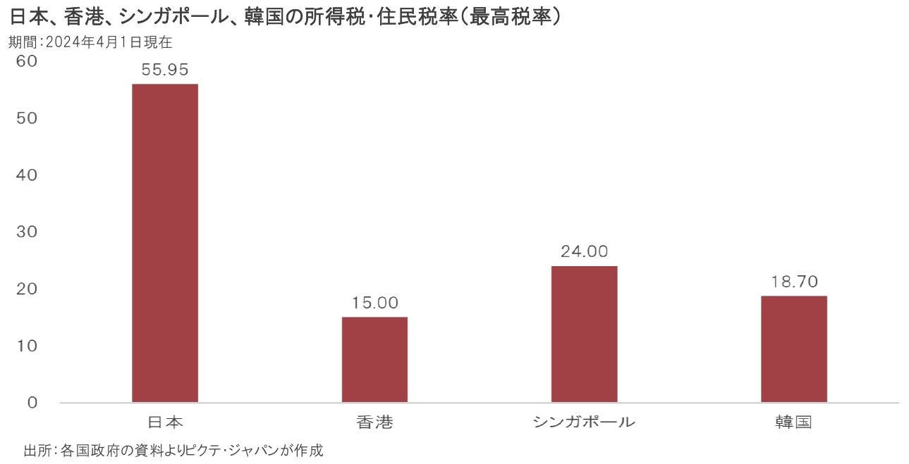 外資系金融機関が東京にアジアの拠点を置くことを躊躇う大きな理由の1つは、他の主要都市と比べて極めて高い所得税・住民税率だ。韓国の場合、要件を満たす外国人には軽減税率を適用している。東京都が発表した構想には、所得税に関する要望は含まれていなかった。しかしながら、この問題を解消しない限り、資産運用立国が実現し、東京がアジアの国際金融ハブになるのは難しいと考えられる。