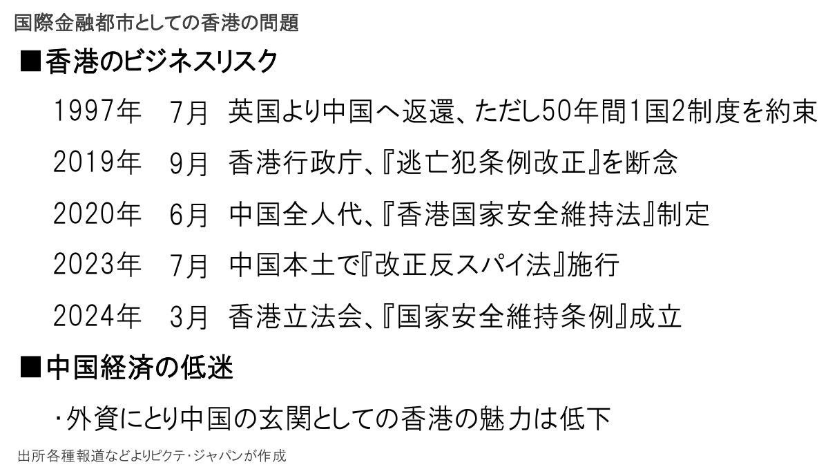 これまで、国際的に展開する金融機関、ファンドのアジアの本部は主に香港に置かれてきた。1997年に英国から中国へ返還されたが、中国は50年間に亘って「1国2制度」を維持すると約束、外資系金融機関、ファンドにとっては中国ビジネスへの玄関として注目されてきたからだろう。また、中国政府にとっても、香港は世界からの投資を呼び込む上で重要な役割を果たしてきた。しかしながら、香港は明らかに転換点を迎えている。
