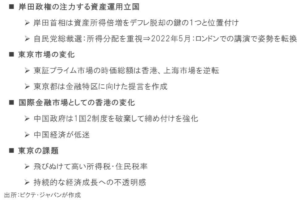 日本経済がデフレからインフレへ転換するなか、岸田政権が資産所得倍増を目指し、資産運用立国を政策の柱としたのは時宜を得た判断と言える。また、香港の地位が揺らいでいることは、東京がアジアの国際金融ハブの地位を奪還する大きなチャンスに他ならない。ただし、それを実現する上での最大の障害は、優秀な外国人ファンドマネージャーなどに対する極めて高い所得税率ではないか。国際的な金融機関、ファンドのアジアの拠点を誘致する上で、この問題への取り組みは避けて通れないだろう。