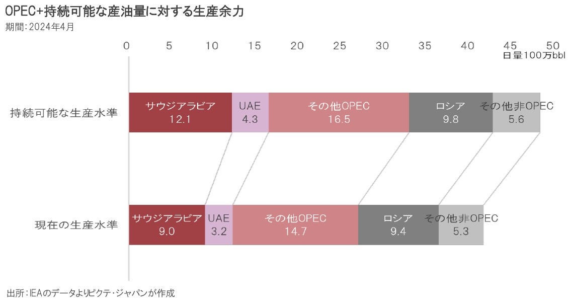 国際エネルギー機関(IEA)によれば、中東最大の産油国であるサウジアラビアの場合、持続可能な原油の生産水準は日量1,210万バレル程度だ。一方、同国の足下の生産量は900バレル程度に止まる。つまり、サウジアラビアは日本の消費量に匹敵する生産余力を有している。中国の成長が急加速しない限り、需給関係のファンダメンタルズから見れば、原油価格が上昇する要因は乏しい。
