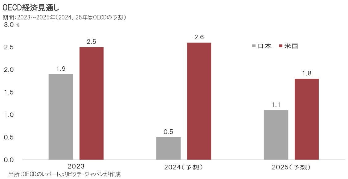 5月1日、OECDは最新の経済見通しを発表した。2024年の実質成長率に関して、米国は従来予想の2.1%から2.6%へ引き上げられている。一方、日本の成長率は1.0%から0.5%へ引き下げられた。米国は政策金利が5%台でも2%台後半の成長が見込まれるのに対し、日本は政策金利がほぼ0%でも成長率が1%に達しない見通しのわけだ。ファンダメンタルズから見れば、ドル高は合理的と言えるだろう。