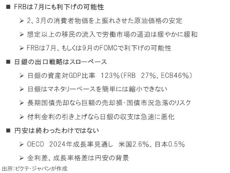 円安が終息したとは考え難い。FRBは早ければ7月、もしくは9月のFOMCで利下げを実施する可能性が高まった。米国で2、3月に物価関連の指標が軒並み市場の想定を上回ったのは、主に原油価格の上昇によるものだ。しかし、ファンダメンタルズから見れば、原油価格の上昇余地は乏しい。中東においてイランとイスラエルが直接的な紛争の拡大を自重したことで、原油価格は落ち着きを取り戻し、4月の米国消費者物価上昇率は縮小に転じた。移民の流入拡大により、労働需給も緩やかに緩和しつつある模様だ。ただし、米国経済は堅調で、FFレートは2025年も4%台に止まると見られる。一方、日銀が年内に利上げを実施する確率は高まっているものの、そのペースは極めて緩慢だろう。結局、2025年も4%程度の日米短期金利差が残ると想定される。OECDによる最新の経済見通しでは、2024年の米国の成長率は2.6%、日本は0.5%だ。政策金利が5%台でも2%超の成長が見込まれる国の通貨が、円に比べてより魅力的なのではないか。
