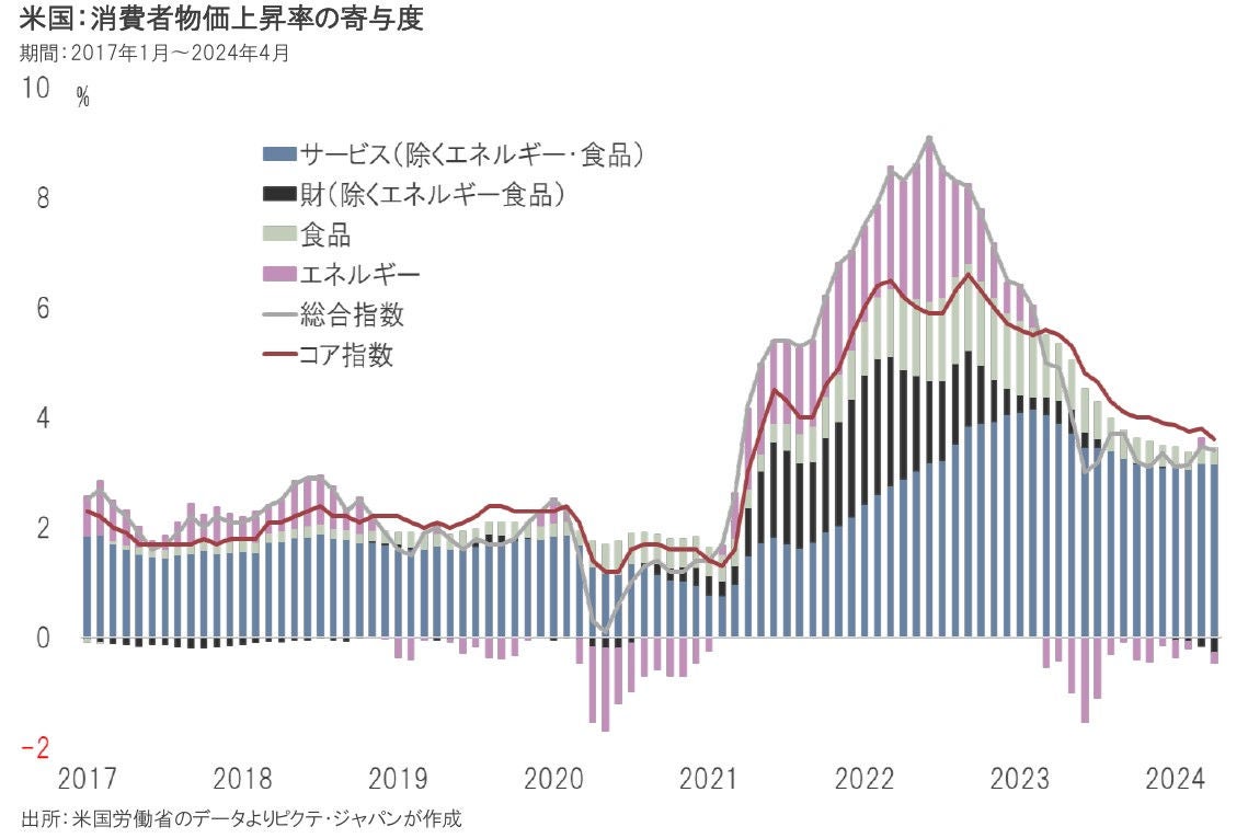 2、3月の米国における物価関連の指標は、軒並み市場の予想から上振れした。背景は原油価格の上昇により、エネルギー指数の物価全体に及す寄与度がマイナスからプラスに転じたことだろう。4月の消費者物価上昇率が、前年同月比で3月に比べ小幅縮小したのは、イランとイスラエルの直接的な紛争が両国の自制により回避されたことで、原油価格の上昇が一段落したからと考えられる。