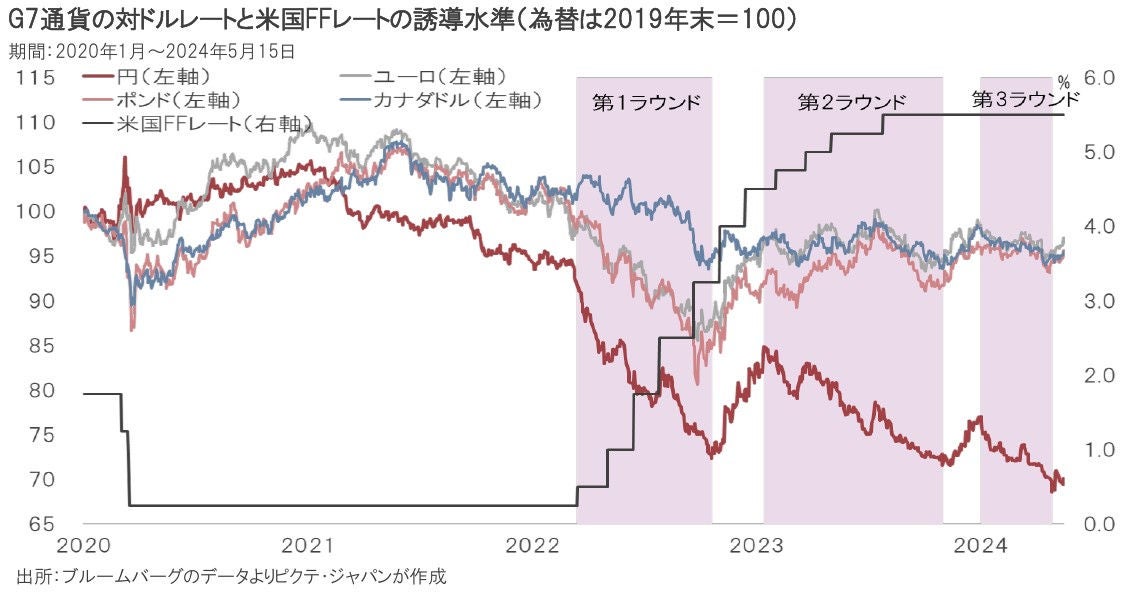 対ドルでの円の下落は、2022年3月に始まった。FRBが最初の利上げを行ったことが背景だ。2023年に入り円が独歩安になったのは、ECB、BOEなどがFRBに追随したのに対し、日銀のみ利上げを行わず、円キャリートレードが活発化したからだろう。今後、FRBは利下げを行うと見られるが、そのペースは緩やかものに止まる可能性が強い。日銀が継続的に利上げを行わない限り、円キャリートレードに有利な状況が続くのではないか。