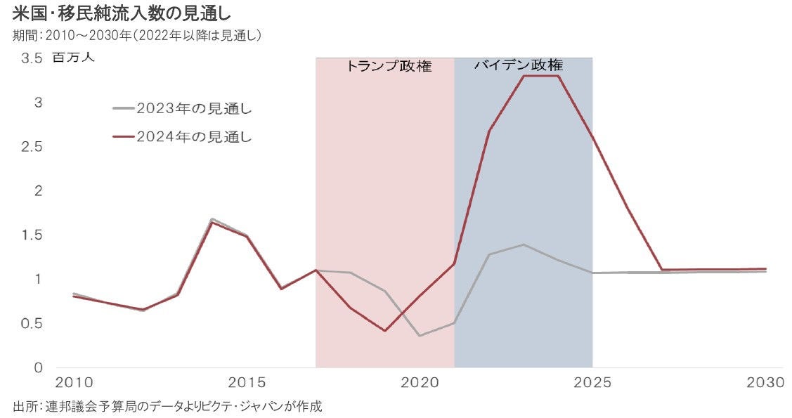 米国連邦議会予算局(CBO)は、今年1月、米国への移民の純受入数について、2023、24年共に従来の120~130万人から330万人へ大幅に上方修正した。米国の人手不足は、ドナルド・トランプ前大統領時代による移民抑制策、新型コロナ禍における実質的な国境封鎖が強く影響している。移民流入の増加により、今後、労働需給は緩やかに緩和、物価上昇圧力も当面は和らぐことが想定されよう。