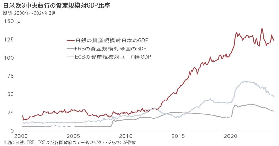 円安の要因は、日米金利差だけではなく、量的な問題もあるだろう。2013年4月に日銀は量的・質的緩和を採用、市場から長期国債を購入し、保有資産を膨張させた。結果として、対GDP比率で見ると、日銀の資産は123%程度に達している。これは、FRBの27%、ECBの46%を大きく上回る水準だ。それだけ、円の潜在的な供給圧は他の主要通貨に比べて極めて強い。歴史的緩和を11年続けた副作用に他ならない。