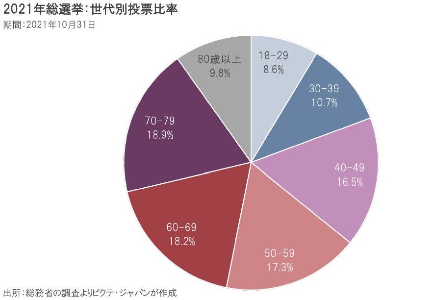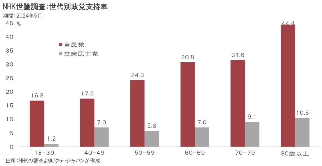 NHKが5月10~12日に行った世論調査では、自民党の支持率は27.5%だった。これを世代別に見ると、18~29歳は16.8%と平均を10%ポイント以上下回るものの、世代が高まるに連れて支持率が上昇、60代で平均を超えている。つまり、今の自民党は若年層から敬遠される傾向があり、年齢の高い層の支持で政権を維持していると言えよう。年齢別の傾向は、野党第1党の立憲民主党も同様だ。