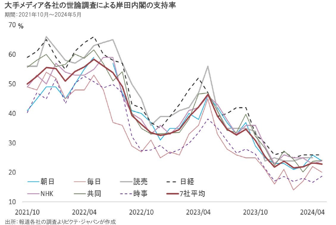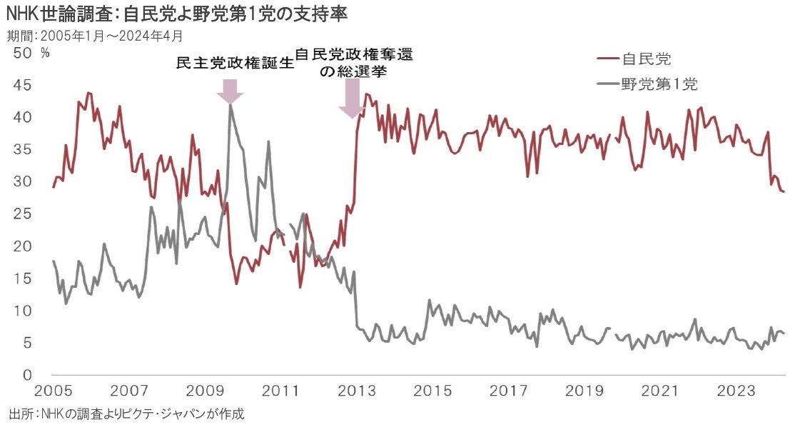 内閣支持率が低迷する岸田政権、自民党にとり、朗報は野党の支持率が上がっていないことだ。NHKの世論調査では、5月、自民党の支持率が27.5%だったのに対し、野党第一党の立憲民主党は6.6%に止まった。2009年8月の総選挙で旧民主党を中心に政権を奪取した際には、同年7月に旧民主党の支持率が自民党を上回っている。現段階でそこまでの勢いが野党側に感じられるわけではない。