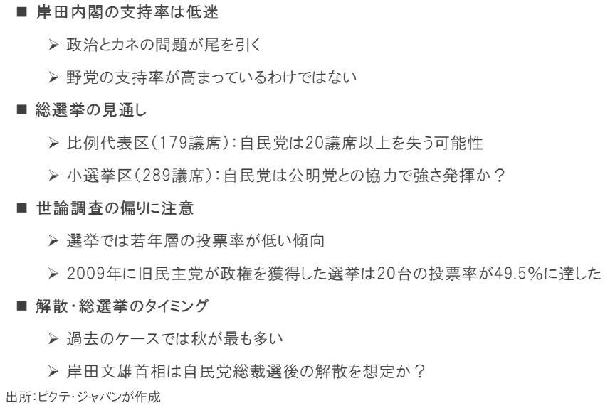 自民党は多くの派閥が解消へ向かい、集団での行動がし難い状況だ。岸田内閣の支持率が低迷しても、岸田降ろしが盛り上がらないのは、数を集めるメカニズムが働かないからだろう。9月の自民党総裁選に有力な対抗馬がまだ見えないなか、今通常国会会期末に岸田首相が解散・総選挙を行う可能性が高いとは考え難い。政治資金規正法改正案を成立させ、政治とカネの問題に一定の決着を着けた上で、岸田首相は再選を掛け総裁選に臨むのではないか。その場合、解散は10月となることが予想される。