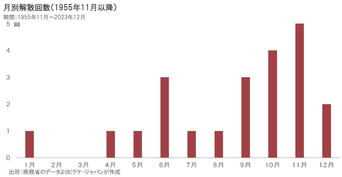 自民党が結党された1955年11月以降、総選挙は22回あった。月別に見ると、最も多いのは11月の5回、それに次ぐのが10月の4回、6月、9月の3回だ。1~5月中が計3回と少ないのは、通常国会開会中であり、予算、重要法案の審議が重なるからだろう。過去の例から見れば、秋の臨時国会で解散し、年内に総選挙を終えた上で、新年には新たな通常国会に臨むのが王道と言えるのではないか。