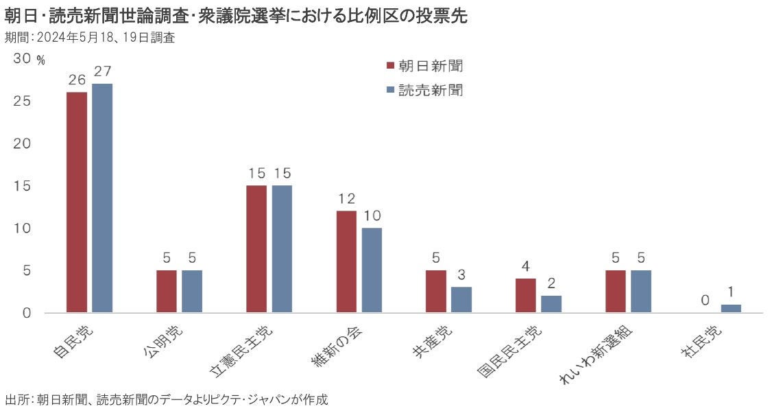 朝日新聞、読売新聞が5月18、19日に行った世論調査によれば、「衆議院選挙の比例代表選挙では、どの政党に投票するか」との設問に関し、「自民党」との回答は朝日26%、読売27%だった。「立憲民主党」は、朝日、読売共に15%に止まっている。両社調査の傾向を見る限り、野党側への期待が高まっているわけではなく、自民党を選択する回答者が減少していると言えるのではないか。