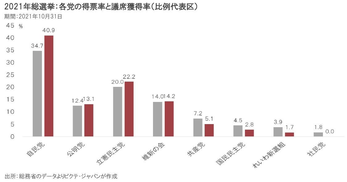 衆議院選挙の比例代表区は、全国を11つのブロックに分けて行うため、全国ベースでの得票率と議席獲得率が完全に一致するわけではない。自民党は前回総選挙で得票率34.7%に対し、議席数は定数176議席のうち72議席、獲得率は40.9%に達した。ただし、比例代表区は得票率と議席獲得率の差は小さく、これらの世論調査を前提とした場合、自民党は比例代表区で20議席程度を失う可能性がある。