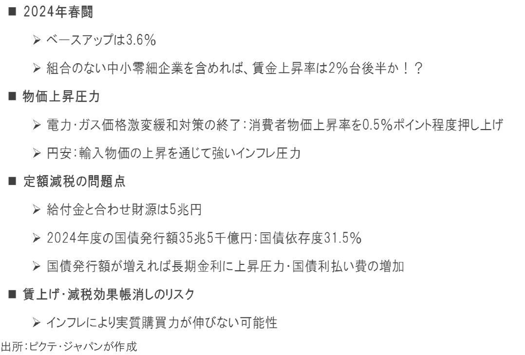 賃上げ・定額減税により消費を刺激する前提は、物価が安定し、消費者の先行きに対する不安が緩和されることではないか。そのためには、本来、日銀が出口戦略を着実に進める一方、政府は経済構造の改革に着手、金利上昇下でも経済成長を確保する必要がある。しかしながら、財政政策と金融政策の馴れ合いが続くなかで、今回の所得税定額減税が円安を加速させる結果、インフレによる実質賃金の目減りを招く可能性は否定できない。消費者の不安が強いなかで、消費を喚起するのは難しいだろう。