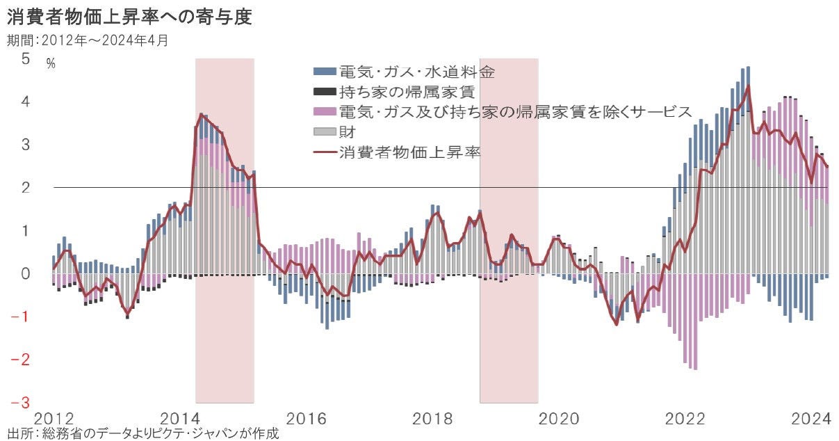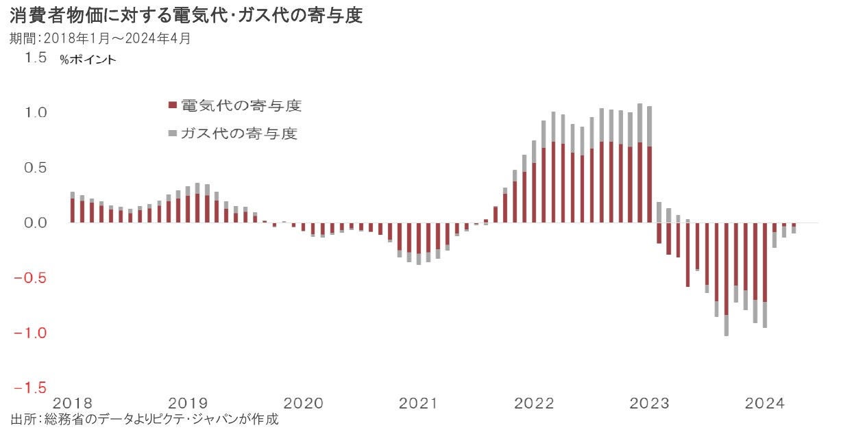 2023年2月、岸田政権は電気・ガス価格激変緩和対策を導入した。ロシアによるウクライナ侵攻でエネルギー価格が急上昇した上、円安により公共料金が高騰したことへの対応策だ。ただし、この事業は5月使用分で廃止された。電力・ガス料金は、昨年9月、消費者物価全体を前年同月比1.0%ポイント低下させたものの、当該措置の廃止により、7月以降は0.5%ポイント程度押し上げるのではないか。