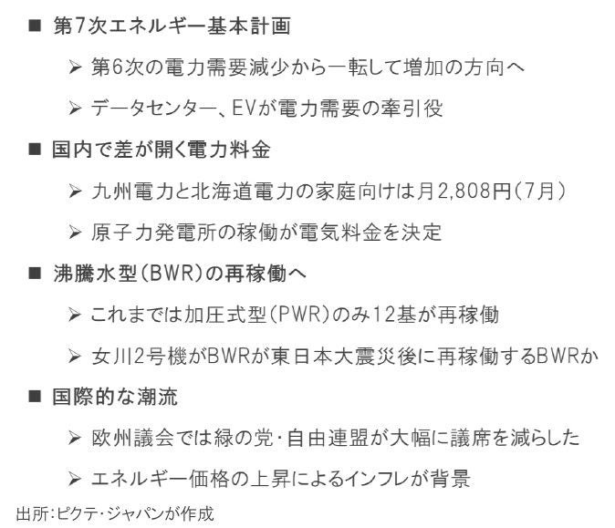 福島第一の事故から13年、原子力は国際的に転機を迎えた。データセンターやEVの普及で電力需要は急速な拡大が想定される一方、カーボンニュートラルの達成、価格の安定も重要な課題だ。それらの条件を考えれば、原子力へのニーズが高まるのは必然の流れだろう。日本も例外ではない。今秋に女川原発2号機が再稼働した場合、柏崎刈羽原発の立地自治体である新潟県の対応にも変化が見られるのではないか。BWRの再稼働は、国内における原子力の大きな転換点となる可能性がある。