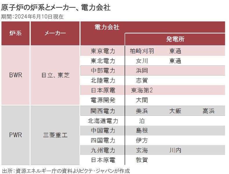 日本の原発は基本的に軽水炉だが、その炉型には加圧式型(PWR)、沸騰水型(BWR)の2種類がある。PWRの建設は三菱重工が手掛け、関電の他、北海道、中国、四国、九州各電力が採用してきた。一方、BWRは、メーカーが日立、東芝、発電は東電、東北、中部、北陸の各社が担っている。電力各社の出資で設立された日本原電はPWR、BWR両炉を持ち、電源開発が建設中の大間原発は改良型BWR(ABWR)だ。