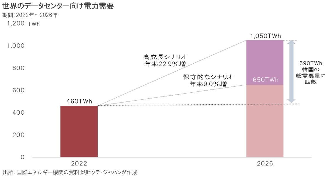国際エネルギー機関(IEA)が今年1月に発表したレポートによると、世界のデータセンター向け電力需要は、2026年までの4年間で保守的な見通しでも年率9.0%成長する。高成長シナリオだと2022年に比べ590億TWh増加するが、それは世界第7位の電力需要国である韓国の消費量に匹敵する水準だ。日本がデジタル化で世界に伍して戦うには、十分な電力の供給体制の整備が重要な鍵を握るだろう。