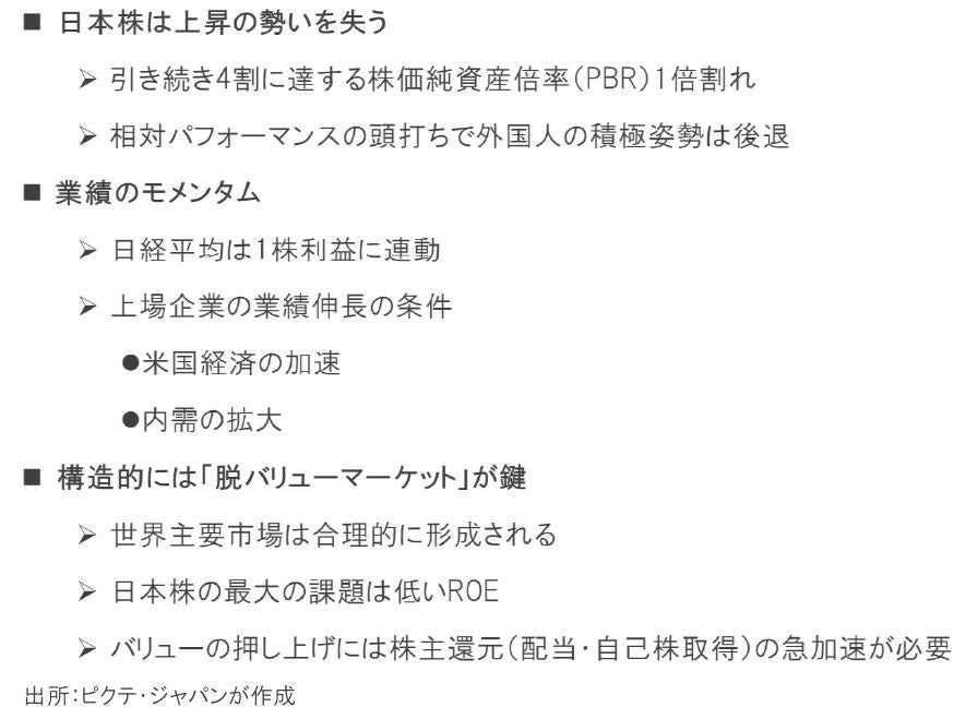 持ち合い解消が進むなかで、アクティビストによる経営への介入や敵対的な買収を阻止したいのであれば、経営者はROEを引き上げることで株主の付託に応える必要がある。日本企業は大きな変化の途上にあり、それは最終的に企業価値を高める可能性が強い。もっとも、問題はスピードだ。方向は正しくても、ペースが遅ければ、株価が停滞する結果、外からの力で強制的に急激な経営改革を迫られるシナリオは否定できなくなった。日経平均の4万円超え定着には、スピード感のある経営改革が条件となろう。