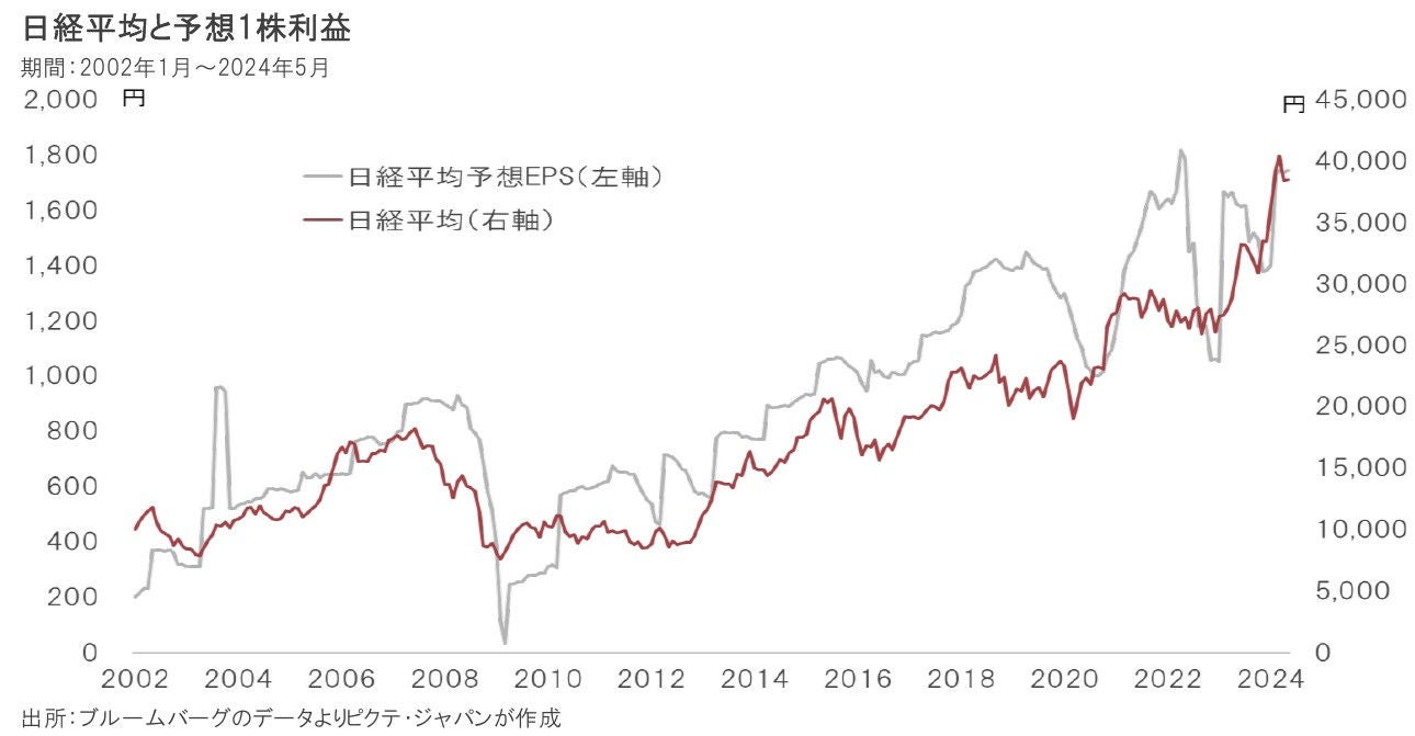 日経平均の予想1株利益(EPS)と日経平均には強い相関性が認められる。1980年代末のバブル期において、東京市場の予想PERは100倍に達し、他の主要マーケットから突出していた。しかし、2000年代に入って業績と株価が連動し、予想PERの水準は基本的に安定している。また、新興市場を含め、世界の主要市場にバリュエーションの極端な差はなくなったグローバリゼーションの一つの側面だろう。
