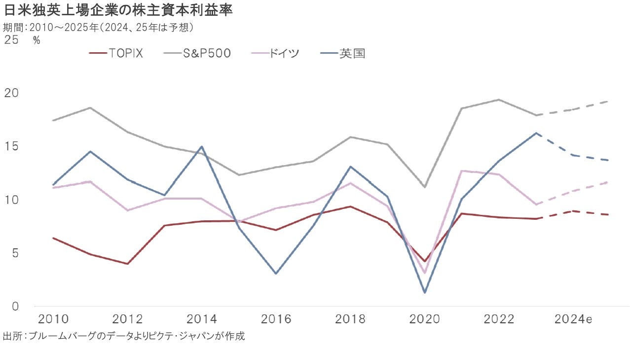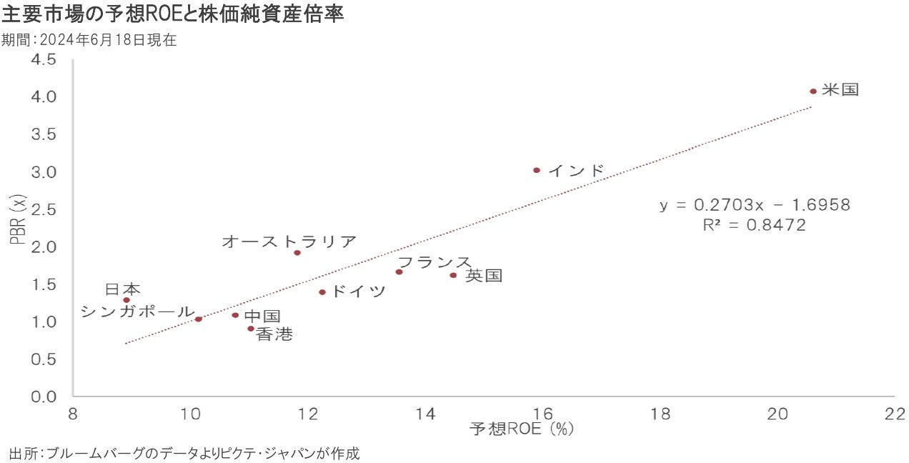 マーケットのグローバル化が進んだことから、主要市場の予想PERには大きな違いがなくなった。そうしたなか、予想ROEとPBRの相対的な関係により比較した場合、この2つのパラメーターには強い正の相関関係が見られる。これは、世界の主要市場に対するバリューの評価が合理的に形成されていることを示すだろう。日本株の場合、ROEが主要市場で最も低い。それが、PBRの低さの要因と考えられる。