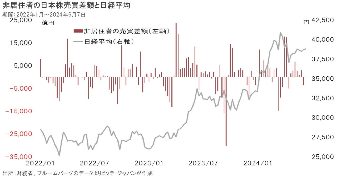 2023年度、非居住者(外国人)による日本株の売買は7兆7,541億円の買い越しだった。今年4月以降も積極姿勢は続き、足下までネットベースで4兆3,544億円の日本株を買っている。もっとも、米国株のパフォーマンスが急速に改善するなか、トレンドフォロー型のファンドについては、日本から米国への乗り換えを図っているのではないか。特にFRBが利下げとなれば、米国はリスクオンになる可能性が強い。