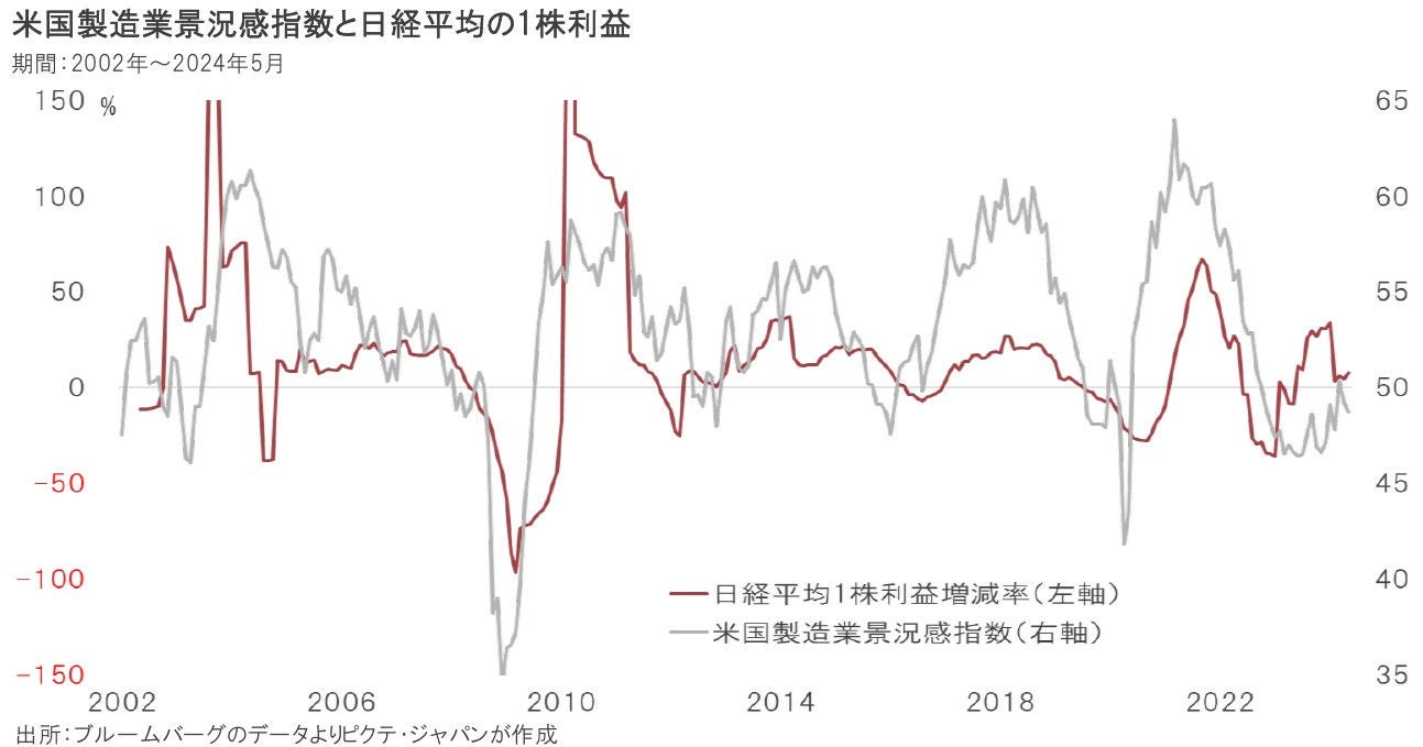 東京市場における当面のベクトルを決める上で最も重要なのは利益のモメンタムだが、日経平均のEPSの変化率は米国の製造業景況感指数に連動する傾向が強い。自動車関連やIT系銘柄など稼ぎ頭の収益が、米国の景気に大きく左右されてきた事情を示すのではないか。それだけ内需が弱かったわけだ。日本株上昇の第1の条件は、米国経済の拡大が続くか、東京市場内において内需系が相場をリードする展開だろう。