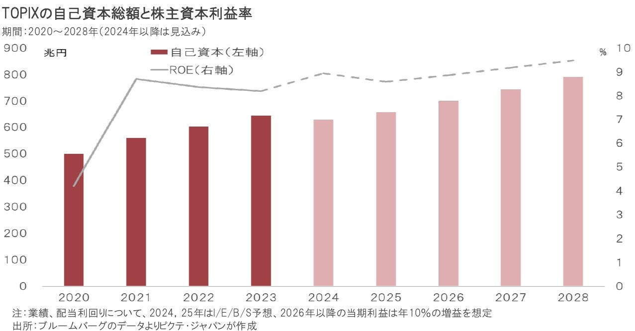 市場の業績予想に基づき、2025年度におけるTOPIXのROEを主要市場の平均を上回る12%にするためには、単純計算で2024、25年度の2年間に187兆円程度の株主還元が必要だ。2023年度の配当総額は19兆6千億円、取締役会で決議された自己株取得枠の設定は9兆6千億円で、いずれも過去最高だった。もっとも、ROEの本格的な押し上げには、それを大きく上回るペースでの還元が必要だ。