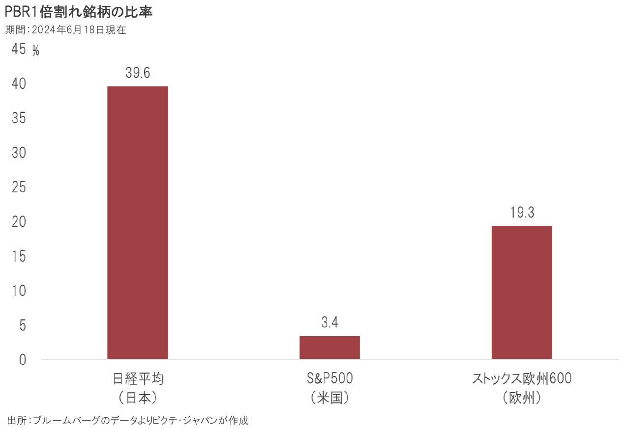 6月18日現在、日経平均に採用された225銘柄のうち、39.6%に相当する89銘柄のPBRが1倍を下回っている。この比率はS&P500だと3.4%に過ぎず、ストック欧州600でも19.3%に止まった。成長力が乏しく、ファイナンスのニーズのない企業が今も数多く上場していることが一因だろう。株式持ち合いによる長期的な安定株主の存在が、そうした無気力な企業の経営を結果的に守ってきたと考えられる。