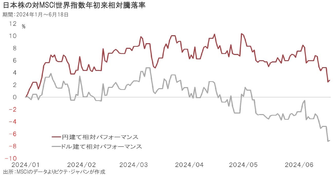MSCIの世界指数に対する年初来の相対騰落率を見ると、日本株は円建てだと3月22日に10.0%、ドル建ても3月8日に4.8%のアウトパフォームだった。もっとも、足下は円建てこそ2.8%のアウトパフォームだが、ドル建てでは7.1%のアンダーパフォームになっている。NVIDIAに牽引され、時価ウェートで世界指数の70%強を占める米国株のパフォーマンス改善により、相対的に東京市場の停滞感が強まった。