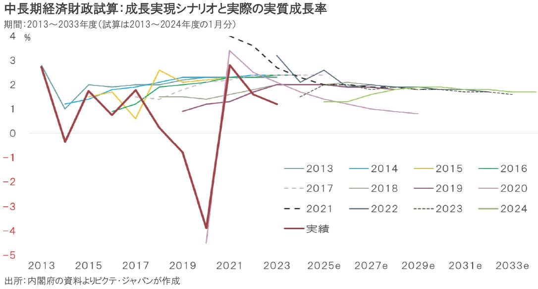過去の試算を振り返ると、成長実現ケースで示された実質経済成長率が実際に達成されたことは稀だ。例えば、2023年度の実質成長率は1.2%だったが、2021年1月の試算では2.1%、2022年1月は1.5%と見込まれていた。要因は非現実的なTFPの伸びを試算の前提としていたことである。現時点においては、ペースラインケースの0.5%が実質的な成長実現シナリオの前提と言えるのではないか。