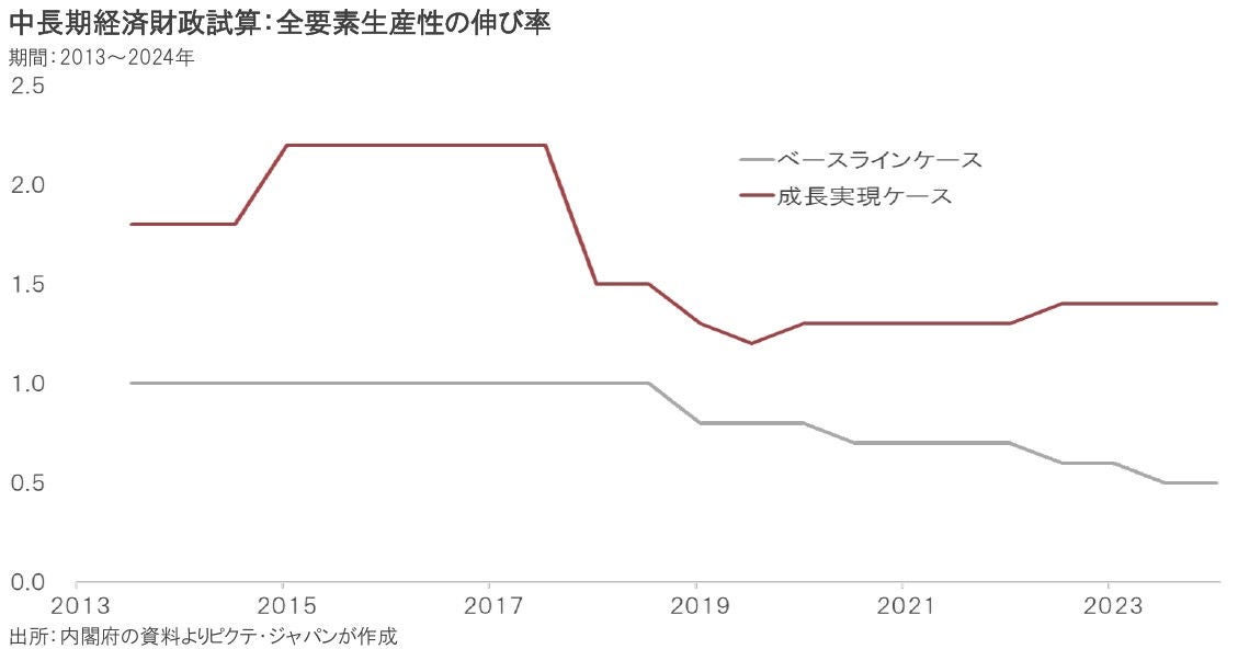 ベースラインケースと成長実現ケースの最大の違いは、想定される全要素生産性(TFP)の伸び率の差だ。ベースラインケースでは年率0.5%だが、成長実現ケースは1.4%である。もっとも、過去10年間の平均は0.4%だ。成長実現ケースは「日本経済がデフレ状況に入る前の期間の平均」としているが、なぜその水準になるのか十分に説明されているわけではない。この試算の最大の弱点と言えるだろう。