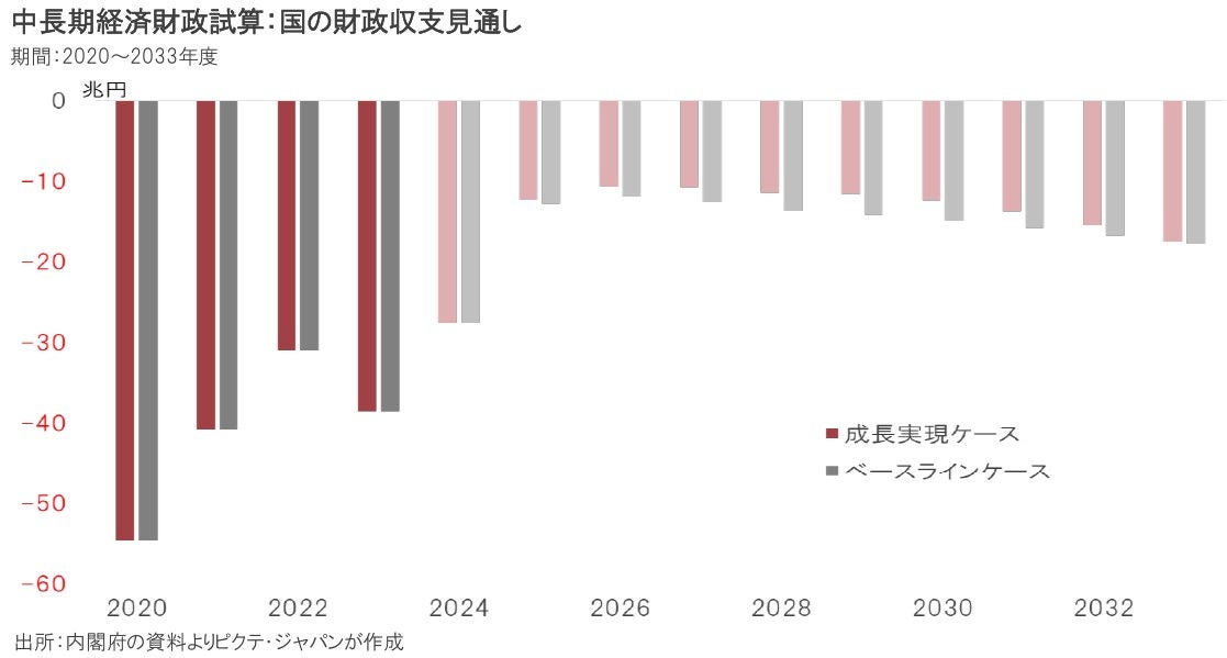 ■ 成長実現ケース、ベースラインケースで国の財政赤字はあまり変わらない