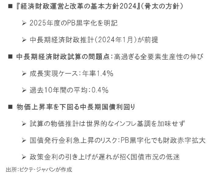 通常国会が実質的に閉会した6月21日、『経済財政運営と改革の基本方針2024』(骨太の方針)が閣議決定された。今回、注目されたのは、基礎的財政収支(PB)に関して、「2025年度の国・地方を合わせたPB黒字化を目指す」と3年ぶりに目標の年限が復活したことだ。背景として、今年1月22日に内閣府が諮問会議に提出した『中長期の経済財政に関する試算』で、成長実現ケースの場合、2025年度のPBの赤字が1.1兆円に止まるとの見通しが示されたことが大きいのではないか。岸田文雄首相は、2025年度へ向けた財政健全化への責任を背負うことで、9月の自民党総裁選での再選に強い意欲を滲ませたと見られる。ただし、中長期経済財政試算は、前提となる全要素生産性(TFP)の伸びが現実から乖離するなど、実現可能性に疑問符がつく。さらに、国家債務が名目GDPの2倍に達するなか、PBが黒字化しても、国債利払い費の急増により財政収支の赤字が肥大化することも考えられる。国債には構造的な売り圧力が続くのではないか。