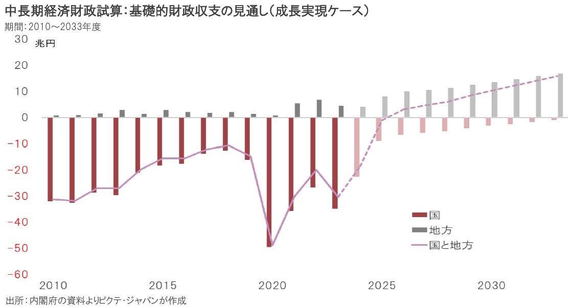 成長実現シナリオの場合、2025年度の国と地方を合わせた基礎的財政収支の赤字は1.1兆円と見積もられ、2018年度の骨太の方針に盛り込まれた同年度における黒字化が視野に入る。さらに、骨太の方針には、「一定の幅でPBの黒字基調を維持」できれば、「長期的な経済・財政・社会保障の持続可能性が確保される」と書かれていた。成長実現シナリオの継続を念頭に置いた判断と見られる