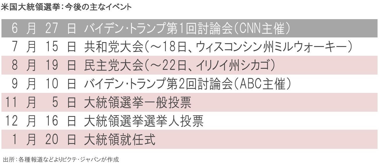 第1回候補者討論会の結果として、トランプ前大統領が優位に立ったと言い切れない理由は、本選まであと4ヶ月あり、民主、共和両党共に候補者を正式に指名する全国大会を終えていないからだ。民主党は候補者を入れ替える可能性すらある。また、バイデン大統領対トランプ前大統領の枠組みは変わらないとしても、9月10日に第2回の討論会が予定されるなど、結果を左右し得るイベントは少なくない。