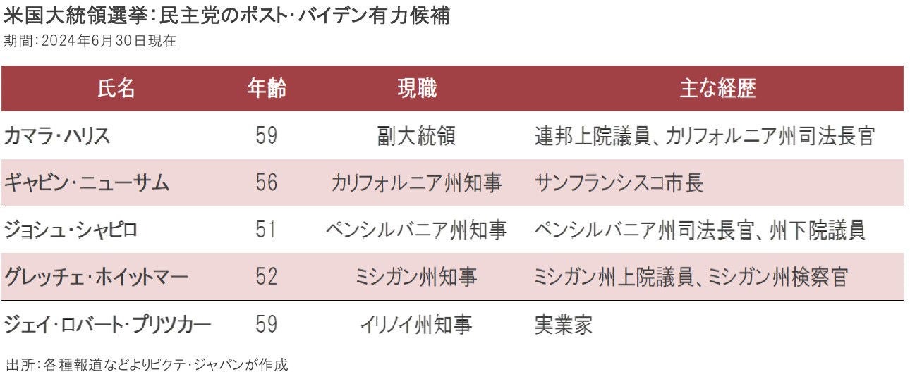 仮にバイデン大統領が候補者指名を辞退した場合、民主党の候補となり得るのは、カマラ・ハリス副大統領の他、カリフォルニア州のギャビン・ニューサム知事、ミシガン州のグレッチェ・ホイットマー知事などと見られる。いずれも「将来の候補」とみなされつつ、現職対前職による異例の戦いに埋没しかねない今回の大統領選挙を避け、新人同士が大統領の座を争う4年後に照準を絞ったと見られる有力知事だ。