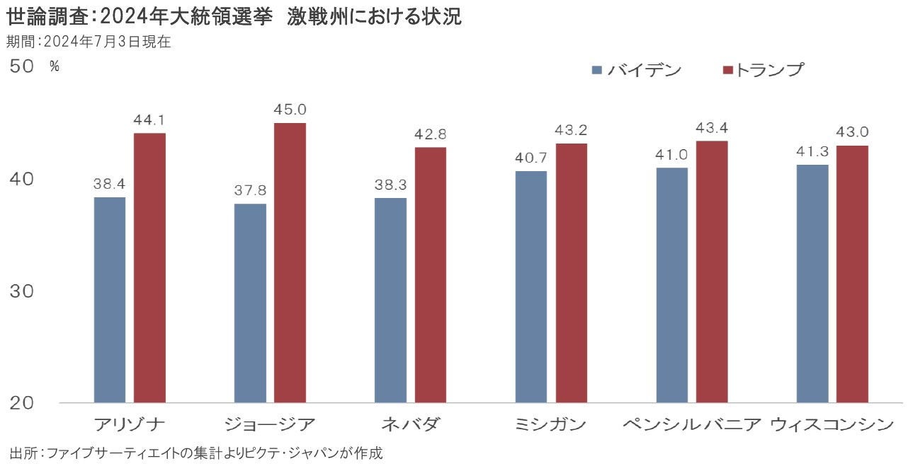 現段階の世論調査では、スウィングステート6州のうち、アリゾナ、ジョージア、ネバダの3州において、トランプ前大統領が4~8%程度ポイントのリードを確保した。さらに、両候補が競っていた”Rust belt(赤錆びた工業地帯)”と呼ばれるミシガン、ペンシルバニア、ウィスコンシンでも、前大統領がリードを拡げつつある。これら6州でトランプ前大統領が優位に立てば、バイデン大統領は苦しい立場となるだろう。