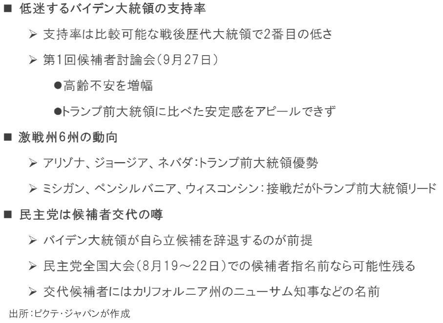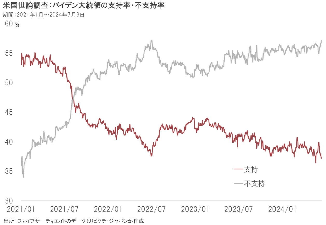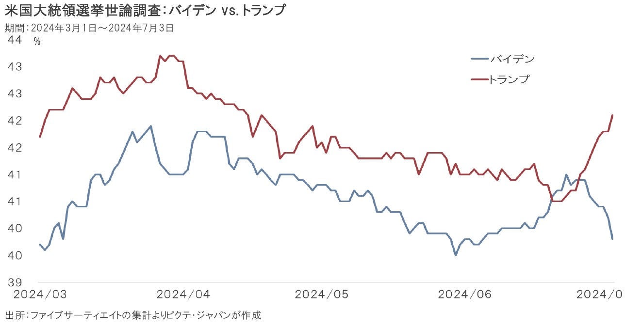 最近の世論調査では、バイデン大統領の支持率が5月30日の39.5%で底を打ち、6月23日には41.0%へ上昇してトランプ前大統領を上回っていた。しかし、現在はトランプ前大統領がリードを拡げている状況だ。6月27日の候補者討論会は、民主党の候補者として疑問が生じるほどバイデン大統領にとり良くない結果と言える。ニューヨークタイムズの社説を含め、立候補辞退を求める声が急増した。